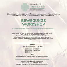 In diesem Bewegungsworkshop steht dein Körper mit seinen individuellen Bedürfnissen im Mittelpunkt. Viele Kursteilnehmer kommen mit wiederkehrenden Nacken- oder Kieferverspannungen, Kopfschmerzen, Rückenschmerzen oder Ohrgeräuschen - oft verbunden mit Stress, hoher Anspannung oder dem Gefühl, "nicht richtig locker lassen zu können". Der Workshop findet bewusst in einer sehr kleinen Gruppe statt. So habe ich ausreichend Zeit, auf dich persönlich einzugehen, dich genau zu beobachten und Übungen an deine Möglichkeiten und Beschwerden anzupassen. Es geht nicht darum, etwas "richtig" zu machen, sondern darum, wahrzunehmen, zu verstehen und neue Bewegungs- und Entspannungsimpulse zuzulassen. Du lernst einfache, alltagstaugliche Übungen kennen, die deine Körperwahrnehmung fördern und helfen können, Spannungen schrittweise zu reduzieren. Dabei erkläre ich dir, warum bestimmte Bewegungen hilfreich sind und wie du sie für dich variieren kannst. Ziel ist, dass du dich sicherer fühlst im Umgang mit deinen persönlichen Übungen und selbst erkennst, was dir guttut. Nach jedem Termin erhältst du eine kurze Zusammenfassung der Inhalte per E-Mail, teilweise ergänzt durch kleine Videos. So kannst du das Gelernte zu Hause in deinem eigenen Tempo wiederholen und vertiefen. Der Bewegungsworkshop richtet sich an Menschen, die sich wieder mehr Beweglichkeit, weniger Schmerzen, Entspannung und Vertrauen in den eigenen Körper wünschen und gleichzeitig Wert auf eine persönliche, achtsame Begleitung legen. Bitte beachte: Es handelt sich nicht um einen Präventionskurs nach §20 SGB V. Eine Kostenübernahme durch die gesetzlichen Krankenkassen ist daher nicht vorgesehen. Was unterscheidet diesen Workshop von einem klassischen Bewegungskurs? Im Mittelpunkt steht nicht das reine Üben, sondern das Verstehen und Wahrnehmen. Du lernst, warum bestimmte Bewegungen hilfreich sind, wie Spannungen entstehen und wie du Übungen an deine persönlichen Beschwerden anpassen kannst. Die Begleitung ist körpertherapeutisch geprägt und sehr individuell.